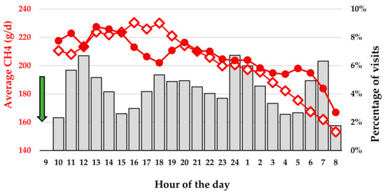 Average number of visits to the GreenFeed systems for all heifers (bar graph) and average CH4 emission rate for Galle heifers (empty) and Borculo heifers (colored filling) over 23 h starting at 9:00 when the heifers were freed. The troughs were filled with roughage (green arrow) at 8:00.