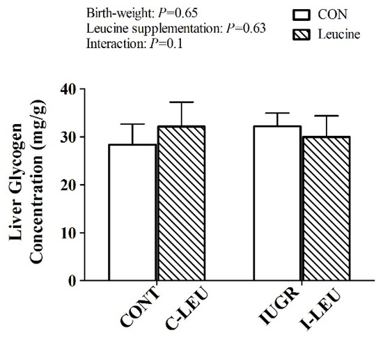 The liver glycogen concentration is shown in Figure 1. There is no significant effect of birth weight, leucine supplementation or their interaction on the liver glycogen concentration of piglets (p > 0.05).