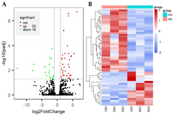 We compared animals from HS and CN group for differences in gene expression using DESeq2 R package (1.16.1). A total of 51 genes fulfilling both criteria of pad < 0.05 and |log2(FoldChange)| > 1, among them, 33 presented upregulated expression in the rabbit of HS group, while 18 presented downregulated (Table S3, Figure 1A). Hierarchical clustering of the DEGs based on condition (HS vs. CN) was conducted to get a deeper understanding of the gene expression patterns. The results exhibited that the DEGs of rabbit in the HS and CN were clustered into a single class (Figure 1B).
