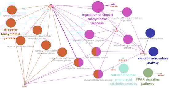 Enrichment analysis of the ACACB, ACLY, LSS, and CYP7A1 genes using the ClueGO plug-in of the Cytoscape program. The nodes are the GO terms, and edges connect the genes involved in the terms.