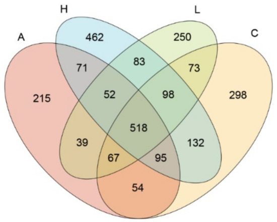 Operational taxonomic unit distribution and composition analysis of fecal content. A Venn diagram of the operational taxonomic unit (OTU) distribution of the fecal contents. Each ellipse represents one group. The overlapping regions between the ellipses represent the OTU that is shared between the following: basal diet as the control (C), basal diet plus 1 g/kg of B. licheniformis-fermented products (L), basal diet plus 4.5 g/kg of B. licheniformis-fermented products (H), and basal diet plus 30 mg/kg antibiotics (bacitracin methylene disalicylate) (A) (n = 3). The value of each region represents the number of OTUs corresponding to the region.