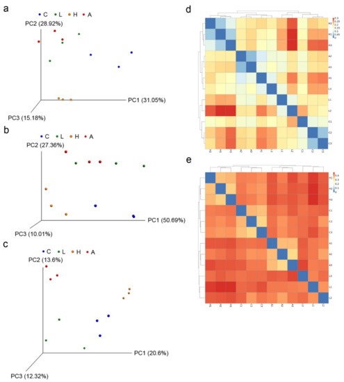 Comparison of the bacterial communities of the fecal contents by advanced analysis. (a) Principal component analysis plots of the fecal contents of basal diet as the control (C), basal diet plus 1 g/kg of B. licheniformis-fermented products (L), basal diet plus 4.5 g/kg of B. licheniformis-fermented products (H), and basal diet, 30 mg/kg antibiotics (bacitracin methylene disalicylate) (A) (n = 3). Principal coordinate analysis of (b) weighted UniFrac and (c) unweighted UniFrac distance of the fecal bacterial communities from C, L, H, and A (n = 3). The beta diversity index of the fecal contents from C, L, H, and A based on (d) weighted and (e) unweighted UniFrac metrics (n = 3).