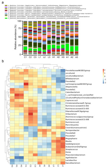 Bacterial taxonomic composition analysis of fecal content. (a) Genus-level composition of the microbiome from fecal content. Composition of major taxonomic groups at the genus level in samples collected from the basal diet as control (C), basal diet plus 1 g/kg of B. licheniformis-fermented products (L), basal diet plus 4.5 g/kg of B. licheniformis-fermented products (H), and basal diet plus 30 mg/kg antibiotics (bacitracin methylene disalicylate) (A) (n = 3). (b) Heatmap of species abundance of the microbiome from fecal content. Abundance distribution of dominant 35 genera (Y-axis) across all samples (X-axis) were displayed in the species abundance heatmap (n = 3). Values are normalized by Z-score.