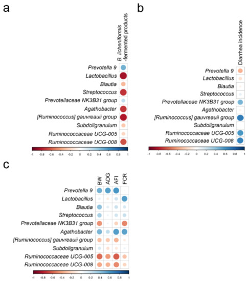 Correlation analysis of fecal microbiota. (a) Correlation analysis between concentration of B. licheniformis-fermented products and abundant genera in piglets of different groups. (b) Correlation analysis between diarrhea incidence and abundant genera in piglets of different groups. (c) Correlation analysis between growth performance and abundant genera in piglets of different groups. Circle sizes and color intensity represent the magnitude of correlation. Blue circle represents positive correlations; red circle represents negative correlations. BW = body weight, ADG = average daily gain, AFI = average daily feed intake, FCR = feed conversion ratio.