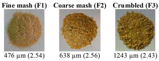 Three different feed types were offered to the birds, fine mash (F1), coarse mash (F2), and crumbled (F3) [10]. The order of the presentation of the different feed types was randomized. The geometric mean diameter (GMD) and geometric standard deviation (GSD) of the feed particles (mash and crumble) were calculated [11] (Figure 2).
