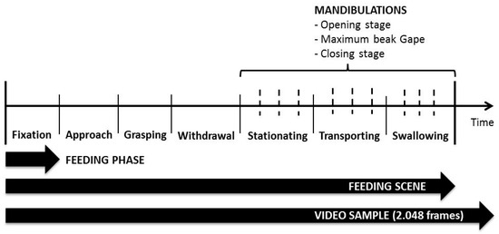 The mandibulation consisted of one cycle of opening and closing of the chick’s beak in the stationing, transport, and swallow phases (Figure 3). The beak opening started when beak began its aperture until its full opening (maximum beak gape) and then its closure. Ultimately, the beak was not entirely closed at the beginning of its aperture and the end of its closure. Frames sequences were classified per mandibulation and one single frame representing the maximum beak gape. Also, each mandibulation were classified in the temporal order that they occurred as first (1), second (2), third (3), fourth, and further on (4), starting right after the withdrawal phase until the last mandibulation before the birds start another feeding sequence in the fixation phase. The fourth classification comprehends the fourth and further mandibulations until the final swallowing. Also, the “catch-and-throw” movements adopted by the birds to repositioning and transport the feed were identified.