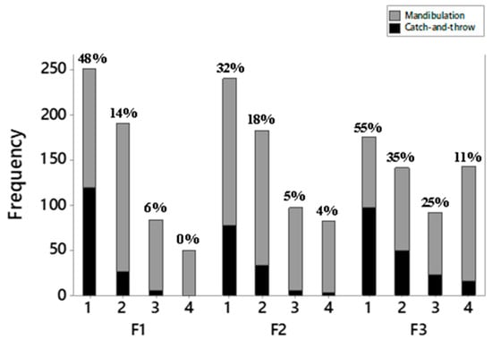 Percentage of “catch-and-throw” occurrences in each mandibulation order (1, 2, 3, and 4) and feed type.