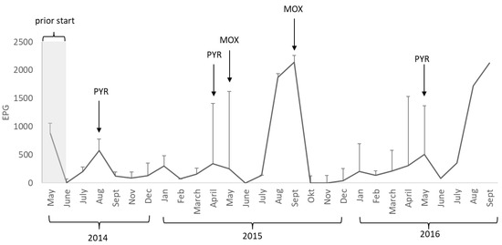 Strongyle egg excretion in eggs per gram feces (EPG). Mean of the study population (all 12 horses) (±SD) each month during 2014–2016. Arrows indicate when all horses were treated and the substance used (PYR = pyrantel, MOX = moxidectin). The egg excretion in May 2014 was before the first deworming and the onset of the study.