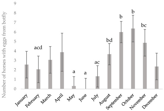 Number of horses with Gasterophilus spp. eggs or egg shells in each month. Results for 12 Gotlandsruss stallions maintained on year-round pasture from May 2014 to September 2016. LSmeans ± SE. Different letters (a, b, c) indicate differences (p < 0.05) between months.