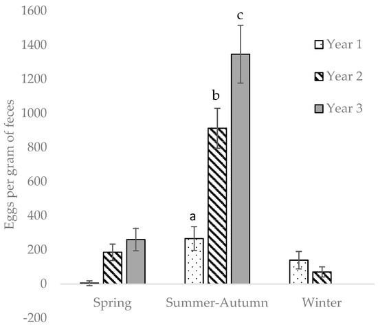 Strongyle egg counts increased year-on-year (p < 0.01) and were higher during summer–autumn than in winter and spring (p < 0.01) (Table 3). For every summer–autumn season, EPG increased (Figure 3), and there was a significant interaction between season and year. There was no effect of enclosure on EPG (p > 0.05). Horses in group B shed higher amounts of strongyle eggs than horses in groups A and C (p < 0.01) (Table 3).