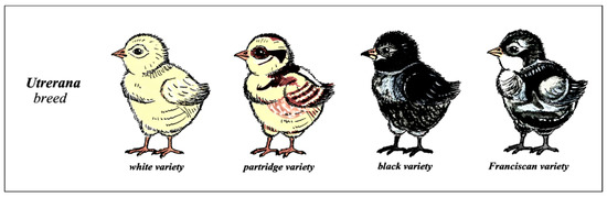 Depiction of Utrerana breed one-day-old chicken varieties.