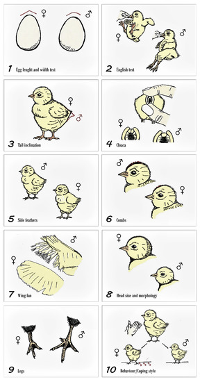 Early determination of sex of poultry specimens plays a major role in the design and implementation of conservation programs for endangered avian species. This information can be used to tailor noninvasive early specific models to determine sex, fitting the characteristics of local poultry populations, as traditional methods may not be effective given the implicit diversity of local breeds and their varieties or strains. The English method, down feather coloration, wing fan, and behavior/coping styles displayed by the individuals can be used to accurately sort animals according to their sex, regardless of the variety of the individuals.