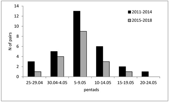 The breeding successes in both periods were similar (65% and 61% for the first and second periods, respectively) and the number of juveniles per breeding pair did not differ (Mann–Whitney test, Z = 1.60, p > 0.05). However, birds in the second period (2015–2018) had fewer fledglings per successful pair (Z = 2.89, p < 0.05) (Table 1). The time when juveniles left their nests (7 May, on average) did not differ between the two periods (Z = 0.35, p > 0.05) (Figure 1). In the first period, reasons for breeding failure were identified in 10 cases: In three cases, a tree with eggs or juveniles was cut down; in four cases, interactions between neighboring pairs of ravens were the cause of the failure; nests fell down twice; and one brood was killed by a marten (Martes sp.). In the second period (2015–2018), only one tree was cut down; one juvenile was found dead under the tree; two nests fell down during a storm; and one brood was killed by a white-tailed eagle (Haliaeetus albicilla); in the remaining cases, the reason for failure was not determined.