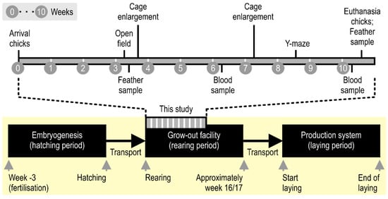 The production of the laying hen consists of three phases that take place in different facilities. After embryogenesis, one-day-old chicks (after hatching) are moved to the grow-out facility for the rearing period. Here they are kept until approximately week 16/17, when they start laying eggs, and are moved to the production system for the laying period. This study addresses the first 10 weeks of the rearing phase.
