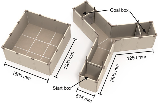 Open field (left panel) and the Y-maze (right panel). Chicks were placed in the center of the OF, and behavior was monitored for 10 min. The Y-maze apparatus consisted of one long arm and two short arms. The end compartment, goal box, of each short arm contained either a social stimulus or a foraging stimulus. The test chicken was placed in the start box, and the test of 10 min began when the guillotine door of the start box was pulled via a lever system. White chalk lines divided the apparatus in sub-compartments that could be used for analysis. Illustrations: Yorrit van der Staay.