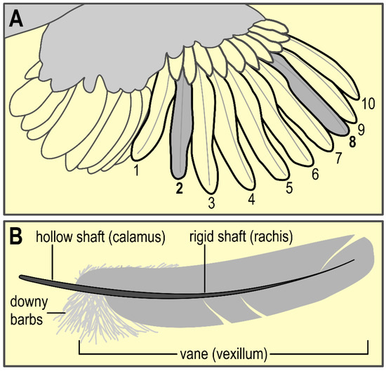(A) Schematic representation of wing anatomy with numbering of primary feathers. For CORT analysis of the feathers, primary feather 2 and 8 were pulled in week 3 and 10. (B) Schematic representation of feather. Downy barbs, calamus, and rachis were removed prior to CORT analysis. Only the vanes were used for determination of corticosterone levels (illustration modified from [26]).