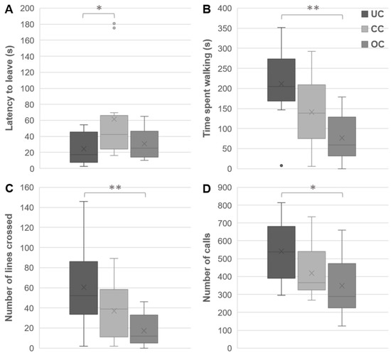 Effects of crowding condition on open field behavior. The latency to leave the start field (A), time spent walking (B), number of lines crossed (C), and number of distress calls emitted (D) during the OF test at three-weeks of age of chicks housed under undercrowding (UC), conventional crowding (CC), and overcrowding (OC) condition. The box ranges from the first to the third quartile, line indicates the median and cross indicates the mean, whiskers represent minimum and maximum without outliers, * p < 0.05, ** p < 0.01.