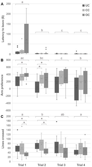 Effects of housing density on Y-maze behavior. The latency to leave the start-box (A), arm preference; with 0 indicating no preference, a positive value indicating the time spent more in the social arm, and a negative value indicating the time spent more in the foraging arm, in s (B), and number of lines crossed (C) of eight-week old chicks during the Y-maze test are depicted. Letters indicate trial differences across the groups, and asterisk indicate group differences within trials. The box ranges from the first to the third quartile, line indicates the median and cross indicates the mean, whiskers represent minimum and maximum without outliers, * p < 0.05 (UC = undercrowding, CC = conventional crowding, OC = overcrowding condition).