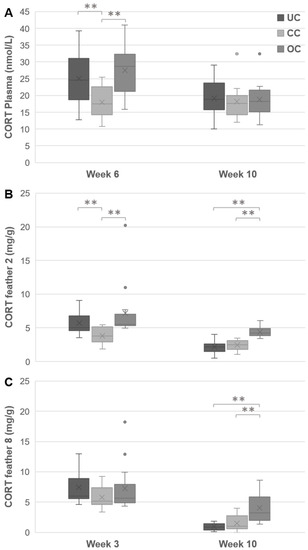 Effects of housing density on plasma CORT levels. The plasma CORT levels (nmol/L) in chicks aged 6 weeks and 10 weeks (A), CORT deposition (pg/mg) in feather 2 (B) and feather 8 (C) at 3 weeks and 10 weeks of age. The box ranges from the first to the third quartile, line indicates the median and cross indicates the mean, whiskers represent minimum and maximum without outliers, ** p < 0.01 (UC = undercrowding, CC = conventional crowding, OC = overcrowding condition).