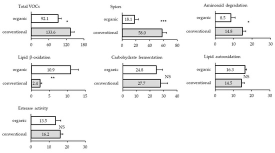 Relative abundance of groups of volatile compounds (VOCs) in dry-fermented sausages (six per treatment group) according to pig husbandry practice (organic or conventional). (NS – p > 0.10, * – p < 0.05, ** – p > 0.01, *** – p < 0.001).
