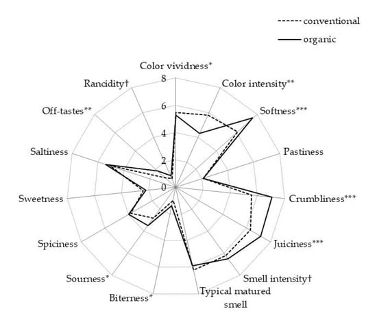 Results of sensory analysis of dry-fermented sausages from organic or conventional pork (Figure 2) also exhibited significant differences related to pig husbandry practice. The panelists scored the color of dry-fermented sausages from organic pigs as being less intensive and somewhat less vivid. The panelists perceived dry-fermented sausages from organic pigs as softer, crumblier, and juicier. As for the taste, panelists found dry-fermented sausages from organic pork as being more bitter, sourer, and slightly more rancid. Dry-fermented sausages from meat of organic pigs received also higher average score for off-tastes.
