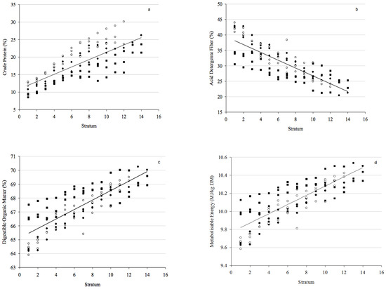 The association between crude protein (CP) (a), acid detergent fiber (ADF) (b), organic matter digestibility (OMD) (c), metabolizable energy (ME) (d), and pasture stratum (in cm) for Farm 1 (black circle), Farm 2 (white circle), and Farm 3 (black square). a: 10.9 + 1.05x, R2 = 0.58, p < 0.0001; b: 39.4 − 1.27x, R2 = 0.67, p < 0.0001; c: 65.1 + 0.34x, R2 = 0.67, p < 0.0001; d: 9.8 + 0.05x, R2 = 0.67, p < 0.0001.