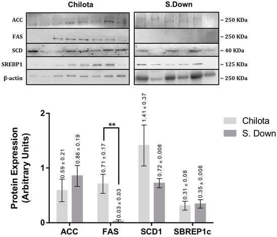 Protein expression levels of ACC, FAS, SCD1, and SREBP1c in subcutaneous fat from Chilota (n = 8) and Suffolk Down lambs (n = 6) grazing Calafatal pasture; analyzed by western blot. The LSM ± SEM values are shown above each bar of the graph. Normalized to β actin expression; ** p < 0.05.