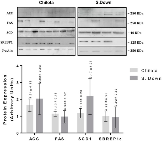 Protein expression levels of ACC, FAS, SCD1 and SREBP1c in tail fat from Chilota (n = 8) and Suffolk Down (n = 4) lambs grazing Calafatal pasture; analyzed by western blot. The LSM ± SEM values are shown above each bar of the graph. Normalized to β actin expression; p < 0.05.