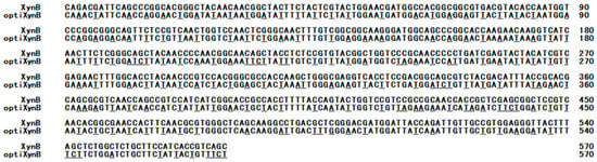 Comparison of T. reesei xylanase gene (XynB) and optimized xylanase gene (optiXynB). The underline letters are the changed codons.