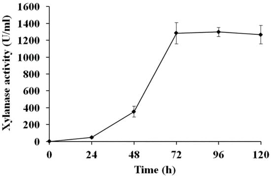 The single positive transformant was selected and induced by methanol. The xylanolytic production was determined every 24 h (Figure 2). After 96 h induction, the highest activity of optiXynB secreted by P. pastoris pPICZaA-optiXynB was 1299 U/mL (Figure 2).
