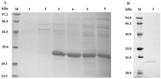 SDS-PAGE analysis. (A) Expressed proteins. Lane M: protein MW markers; Lane 1–6: the crude xylanase from P. pastoris pPICZαA-optiXynB at 24 h, 48 h, 72 h, 96 h, 120 h, and 144 h. (B) Purified optiXynB. Lane M: protein MW markers; Lane 1: the purified optiXynB.