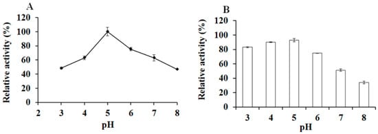 Xylanolytic detection at different pH buffers showed that the optimal pH of the optiXynB was 5.0 (Figure 4A). The activity of optiXynB exhibited less activity (46–48%) at pH values below 3.0 and above 8.0 (Figure 4A). The optiXynB was stable (over 80%) at pH 3–5, and its activity decreased rapidly when incubated at pH 8.0 for 30 min (Figure 4B).
