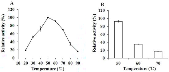 The optiXynB was optimal at 50 °C (Figure 5A). The activity of optiXynB showed less activity at temperatures below 20 °C and above 80 °C (Figure 5A). It was stable at 50 °C for 30 min, and kept about 91% of its highest activity (Figure 5B). However, the activity of optiXynB decreased rapidly when incubated at 60 °C and 70 °C for 30 min (Figure 5B).