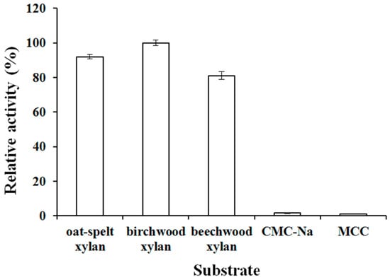 Substrate specificity for the recombinant xylanase. The activity value for birchwood xylan was set as 100%. CMC-Na: sodium carboxymethylcellulose, MCC: microcrystalline cellulose