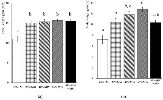 To evaluate the dietary effects of replacement of FM with MW in the diets of red seabream, a feeding trial was conducted. Partial or complete replacement of FM with DMW-1 in the diets of red seabream led to significantly increased FL compared to in fish fed with the 65% FM diets (Figure 1; Table 5). The BW gain of fish increased depending on the level of DMW-1 content in the experimental diets (Figure 1; Table 5). The feed intake increased with the higher MW inclusion, but there were no clear differences between the feed conversion ratios for any of the dietary groups (Table 5). In the 65% MW + MO group, the FL gain did not show any difference, but the BW gain rates, specific growth rates (SGR), and feed intake levels were significantly decreased compared with in the 65% MW group.