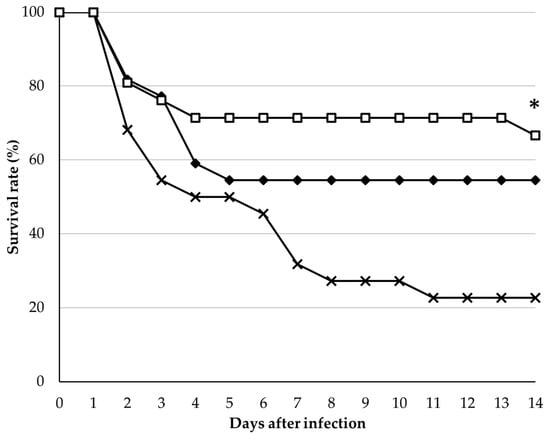 Survival rates of red seabream after infection with Edwardsiella tarda. Control diet group (X mark), 5% MW diet group (filled diamond), and 10% MW diet group (open square). The asterisk * indicates statistically significant differences compared with the control group using a log rank test with a Bonferroni correction (p < 0.05).