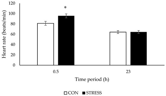 26]. Similarly, in the present study, sheep vocalized more, heart rate was elevated and cortisol concentrations tended to be higher in response to a 0.5 h visual isolation test; therefore, it appears as though both the sympathetic nervous system and the hypothalamic–pituitary–adrenal (HPA) axis were activated in response to this stressor. After 23 h in the visual isolation test, cortisol concentrations were still elevated in ewes, but not heart rate. This is to be expected, as activation of the sympathetic nervous response occurs quickly and often returns to baseline rapidly [