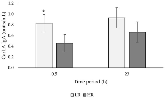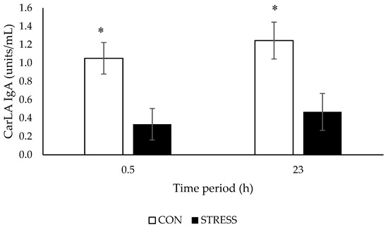 27] defined an acute stressor as lasting for a period of minutes to hours, whereas a chronic stressor persists for several hours per day for weeks or months. Therefore, in the present study, both time points measured can only be considered as an acute stress response. Further studies investigating the impact of chronic stress on CarLA IgA concentrations are required.