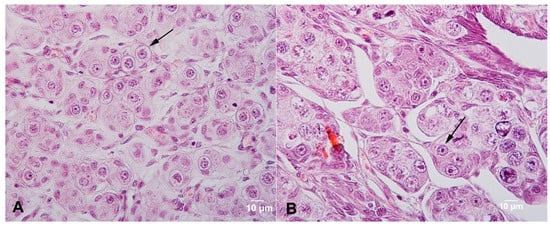 Sterlet Acipenser ruthenus gonads. (A) Sterlet testis at maturity stage II (10-month-old); (A) showing spermatogonia (black arrow) and Sertoli cells; (B) Sterlet ovary in maturity stage II (10-month-old); (B) showing oogonia (black arrow) and early oocytes.