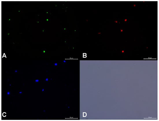 Immunofluorescence showing co-localization of neonatal cells at 10-days culture. Gonads were digested with trypsin and cultured at 21 °C in L-15 medium and 10% fetal bovine serum (FBS) (v/v). Cells were stained green for BrdU protein (A), red for Vasa protein (B) and blue for 4′,6-diamidino-2-phenylindole (DAPI) (C). (D) White light.