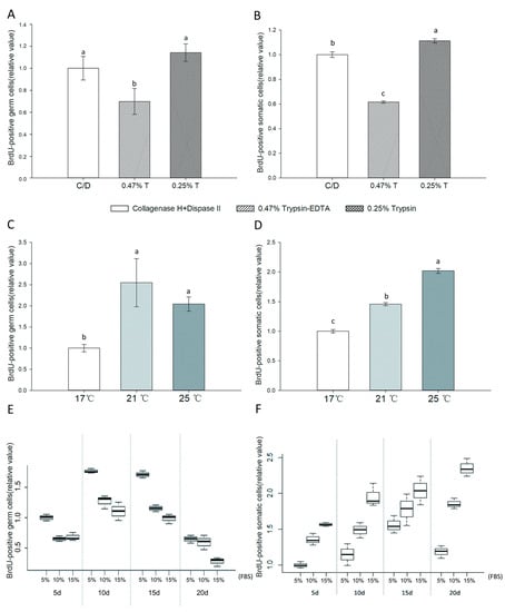Influence of enzymatic dissociation (A,B), culture temperature (C,D), and FBS (5–15%) (E,F) on BrdU incorporation into Dabry’s sturgeon germ cells. (A,B): Gonads were dissociated with 2 mg/mL collagenase H and 500 U/mL Dispase II (C/D); 0.25% trypsin (0.25% T), or 0.47% trypsin– Ethylenediaminetetraacetic acid (EDTA, 0.47% T-EDTA). Cells were cultured in L-15 medium (pH 8.0) supplemented with 15% FBS for 10 d at 25 °C. (C,D) Gonad was dissociated with 0.25% trypsin and cultured in L-15 medium supplemented with 15% FBS (pH 8.0) for 10 d at 17, 21, and 25 °C. (E,F) Gonad was dissociated with 0.25% trypsin and cultured in L-15 medium (pH 8.0) under selected concentrations of FBS (5–15%) at 21 °C. BrdU assays were performed every 5 d. Data are shown as mean ± SEM (n = 4) of relative values for germ cells and somatic cells by immunofluorescent co-localization of BrdU and Vasa. The values of collagenase H, Dispase II (A,B), 17 °C (C,D), and 5% FBS (5 d) (E,F) were defined as the relative value 1.0. Values with different lowercase letters are significantly different (p < 0.05).