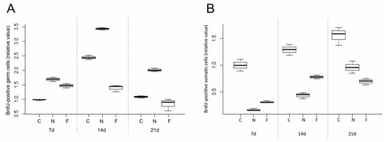 Effects of somatic cells on mitotic activity of Dabry’s sturgeon germ cells (A) and somatic cells (B). The figure shows mean ± SEM (n = 3) of total mitotic activity under control (C), feeder-free (N), and feeder layer conditions (F). The BrdU assay was performed on days 7, 14 and 21 of culture. Data are shown as the mean ± SEM (n = 3). The values for 7-d control were defined as the value relative to 1.0. Values with different lowercase letters were significantly different according to two-way ANOVA (p < 0.05).