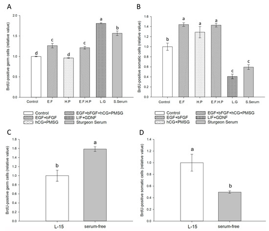 Effects of selected soluble growth factors on mitotic activity of Dabry’s sturgeon germ cells (A) and somatic cells (B). The number of germ cells was counted on Day 10. The somatic cell mitotic activity after addition of EGF and bFGF (E.F), hCG and PMSG (H.P), EGF/bFGF/hCG and PMSG (E.F.H.P.), LIF and GDNF (L.G.), and sturgeon serum (S. Serum) is shown. Data are shown as the mean ± SEM (n = 3). The control values (A,B) were defined as the relative value 1.0. Values with different lowercase letters are significantly different (p < 0.05) according to one-way ANOVA. Effect of replacement of FBS on mitotic activity of germ cells (C) and somatic cells (D). The number of germ cells were counted on Day 10. Cells were cultured at 21 °C in L-15 medium (pH 8.0) supplemented with 25 mM HEPES, antibiotics, 5% FBS, and 25 ng/mL LIF and GDNF (L-15, white bar) and StemPro-34 Serum-Free Medium with supplement (serum-free, gray bar). Data are shown as mean ± SEM (n = 3). The values of L-15 medium were defined as the relative value 1.0. Values with different lowercase letters are significantly different (p < 0.05) according to t-test.