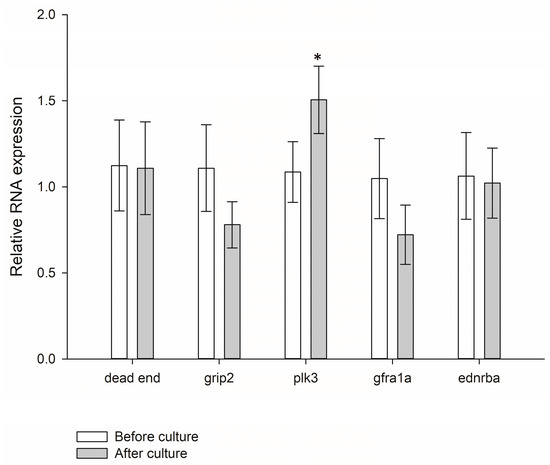 Expression of dead end, grip2 plk3, gfra1a, and ednrba in germ cells before and after 10-d culture. Data are shown as mean ± SEM (n = 3). Differences were considered significant at p < 0.05. The asterisk indicates significant difference of gene expression compared to before culture according to paired t-test.