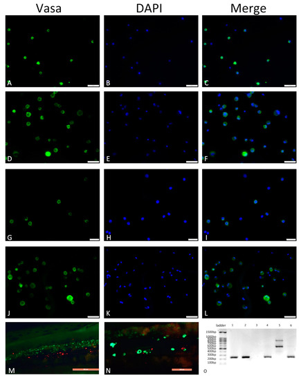 To examine whether the transplanted germ cells could develop in recipient gonads, cells cultured for more than 40 d under serum-free conditions were injected into the body cavity of Russian sturgeon larvae. Before transplant, immunolabeling indicated that more than 91% of injected cells were germ cells (Figure 8A–L). Recipient fish were dissected one-month post-transplant. In 50%, attachment and development of the cultured cells in the recipient genital ridge could be detected (Figure 8M,N). After four months, PCR showed 33% of recipient fish to display sterlet-specific bands. In all gonad samples, fragments from both donor and recipient could be detected, which matched the fin tissues of the two species (Figure 8O).