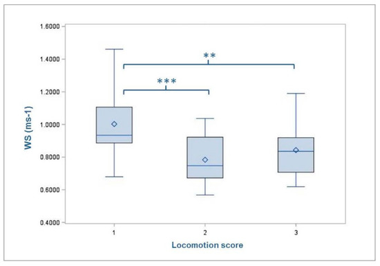 Mean walking speed (WS) of the cows with regard to the degree of rated locomotion score. Level of statistical significance between the LSMEANS is indicated by the number of asterisks (** p < 0.01; *** p < 0.001). The mean value of each LS-group is indicated by the following symbol: ◊ inside the boxes.