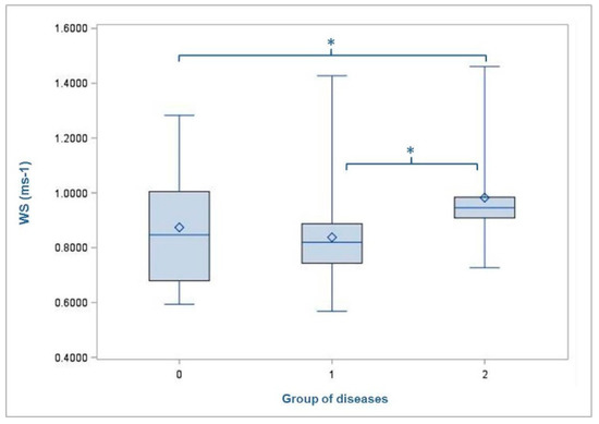 Mean walking speed (WS) of the cows with regard to the diagnosed type of diseases (group 0 = no diseases; group 1 = non-infectious diseases; group 2 = infectious diseases). Level of statistical significance between the LSMEANS is indicated by the number of asterisks (* p < 0.05). The mean value of each group of disease is indicated by the following symbol: ◊ inside the boxes.