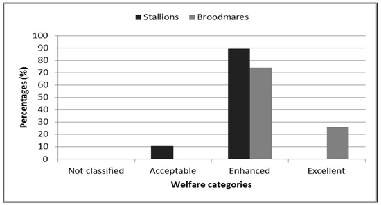 The welfare quality of the stallions and broodmares is presented in Figure 1. Based on the scores obtained, the stallions were classified in the acceptable (10.6%) and enhanced (89.4%) welfare categories, and the mares were classified in the enhanced (74.2%) and excellent categories (25.8%), respectively.