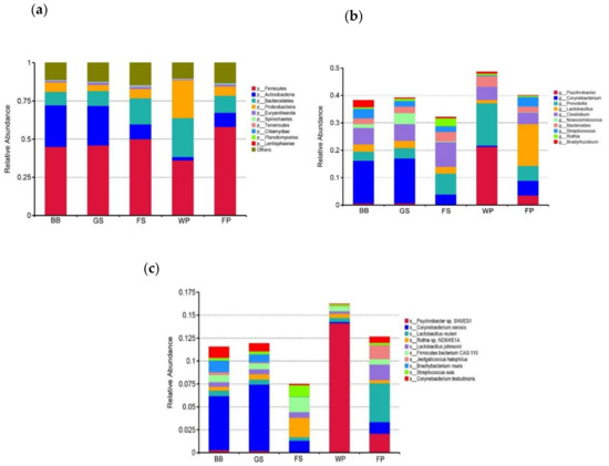 For the five bioaerosol samples, “Bacteria” predominated with relative abundance level of 91.95%, 90.43%, 88.81%, 93.36%, and 90.69% in the BB, GS, FS, WP, and FP bioaerosols, respectively. Bioaerosol from WP exhibited a lower abundance of “Archaea”, 0.47%, compared to bioaerosols from other kinds of SCBs (more than 1.1%) (Figure S1a). The top 20 genera present in all samples were identified and Prevotella and Clostridium were the most abundant taxa, with a relative abundance of 6.77% and 6.62%, respectively (Figure S1b). Taxonomical assignments also indicated that the microbial composition varied between samples in each taxonomy hierarchy, particularly for the phylum, genus, and species. In comparison, the most abundant phyla were Firmicutes (44.99% in BB bioaerosol, 45.98% in GS bioaerosol, 50.04% in FS bioaerosol, 36.15% in WP bioaerosol, and 58.06% in FP bioaerosol), followed by Actinobacteria (27.23% in BB bioaerosol, 25.85% in GS bioaerosol, 9.71% in FS bioaerosol, 2.24% in WP bioaerosol, and 9.32% in FP bioaerosol), Bacteroidetes (8.81% in BB bioaerosol, 9.78% in GS bioaerosol, 17.04% in FS bioaerosol, 25.49% in WP bioaerosol, and 11.11% in FP bioaerosol), and Proteobacteria (6.16% in BB bioaerosol, 3.96% in GS bioaerosol, 6.17% in FS bioaerosol, 24.69% in WP bioaerosol, and 6.14% in FP bioaerosol) (Figure 3a). At the genus level, Corynebacterium was the most dominant taxon in both BB and GS bioaerosols. In contrast, Clostridium, Psychrobacter, and Lactobacillus were the most abundant genera in the FS, WP, and FP bioaerosols, respectively (Figure 3b). At the species level, Corynebacterium xerosis was the most abundant taxon in both BB and GS bioaerosols and the Rothia sp. ND6WE1A, Psychrobacter sp. SHUES1, and Lactobacillus reuteri were the most abundant species in the FS, WP, and FP bioaerosols, respectively (Figure 3c).