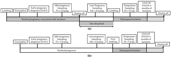 Timeline of monitoring of (a) pregnant adult sheep and (b) pregnant maiden sheep. Measurements were taken three times (in mid-pregnancy, in late pregnancy, and postpartum) distributed over the “studied” lactation and pregnancy as well as the “subsequent” lactation.